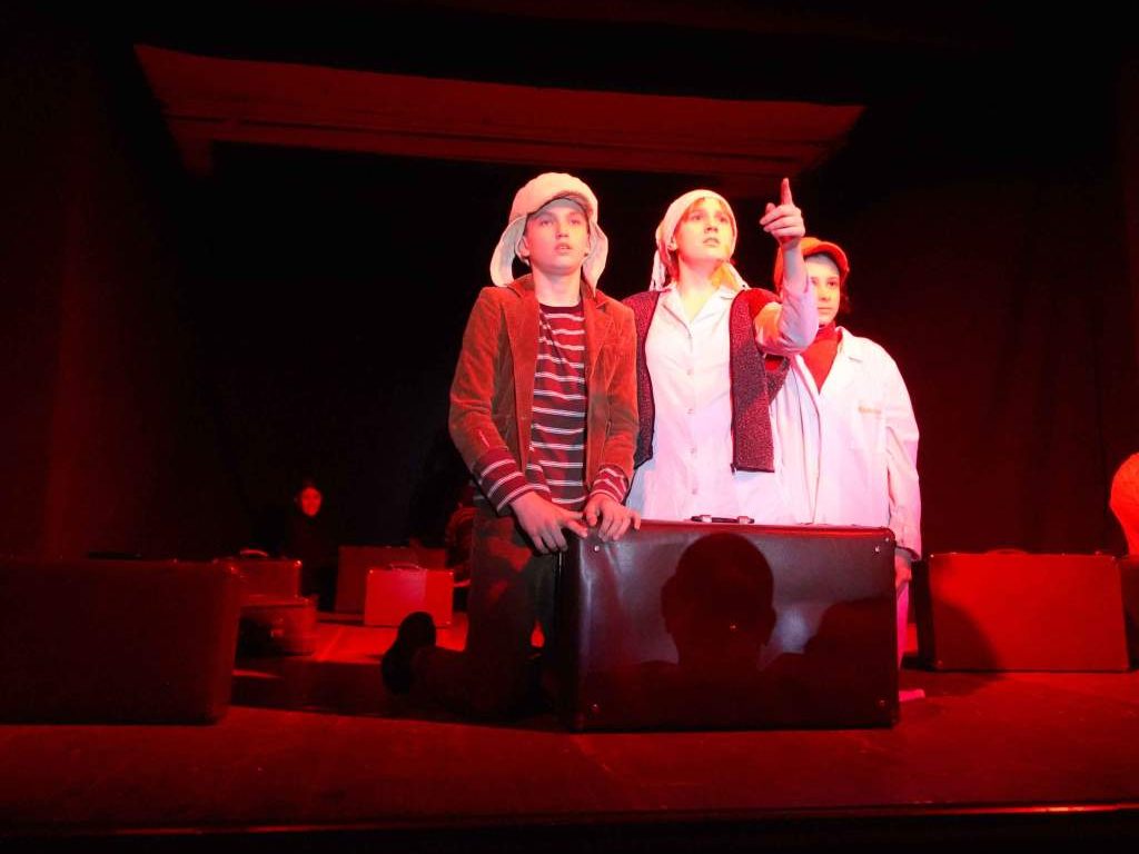 Детали в приближении, правдиво выхваченные и показные с использованием неких символов, недосказанности — гораздо красноречивей фактов. Минимализм сценографии складывался из старых, видавших виды, перемещающихся и выстраивающихся так и этак чемоданов. Тревогу передали залу постоянно перемещающиеся беженцы, «поезда» с движущимися по кругу острыми локтями. Боль звучала через прочитанные письма от малышей из детского дома на фронт — их отцам. Войну представляла девушка, пластично, ломано и зловеще перемещающаяся по сцене, и, конечно, добавляла эффект игра света и звука.