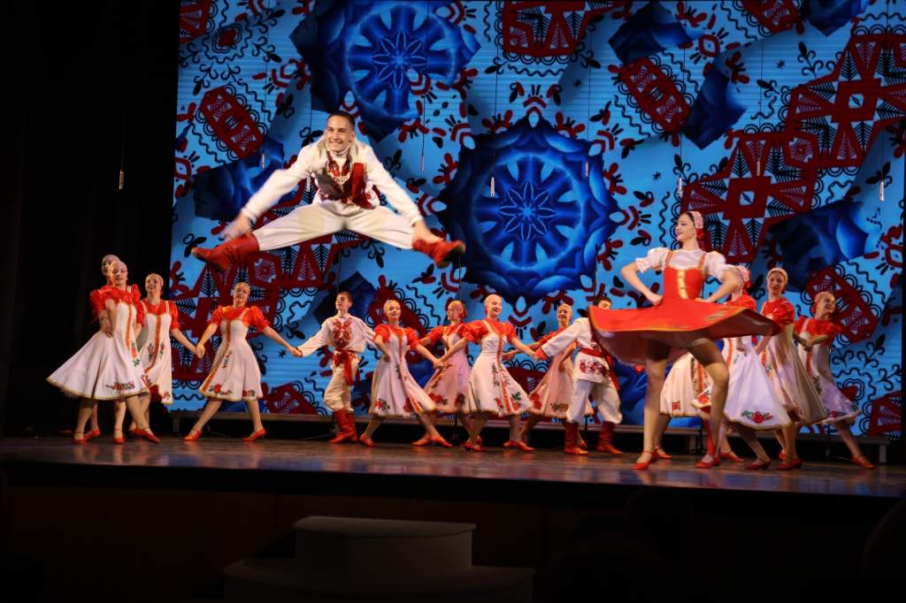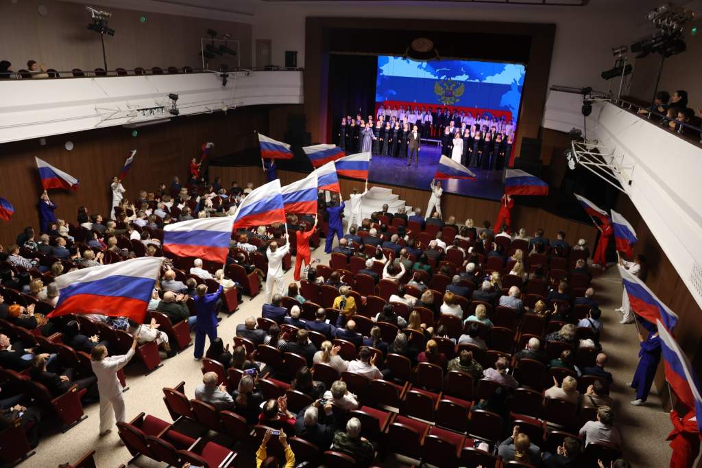 В целом программу праздничного вечера перемежали, в основном, зажигательные танцы, в том числе разных народов, и патриотичные песни. В завершение концерта, когда на сцене пел сводный хор, в зрительный зал вышли девушки-танцовщицы в белых, красных и синих сценических костюмах. Вышли не с пустыми руками, а с российскими флагами. И флаги были, словно крылья двуглавого орла.