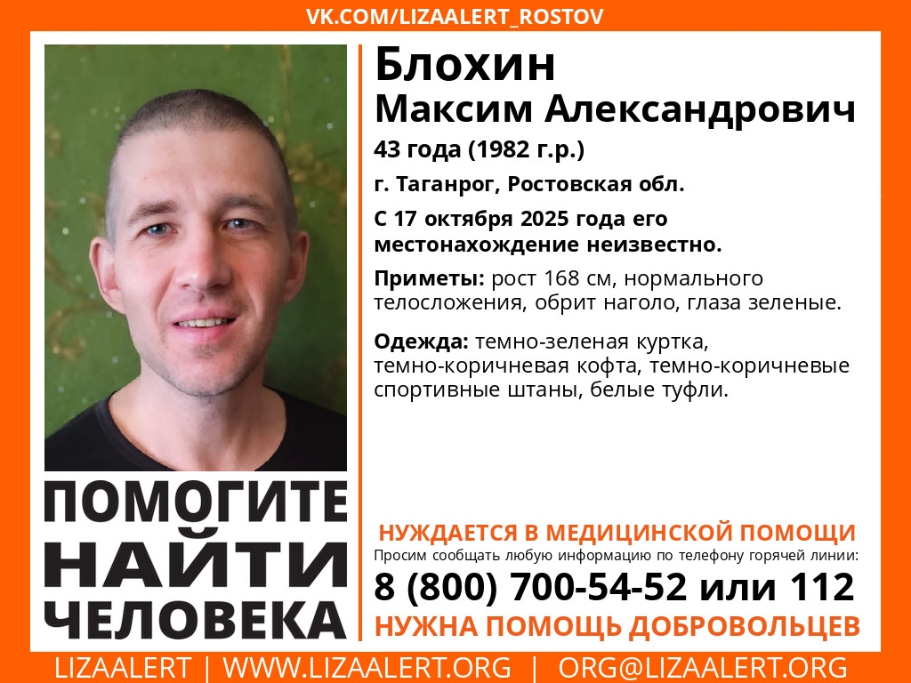 В Таганроге пропал 43-летний Максим Александрович Блохин, который может нуждаться в медицинской помощи, сообщает на своей страничке ВК поисковый отряд «Лиза Алерт».