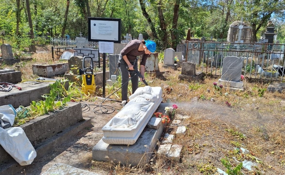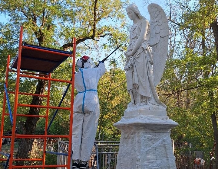 Аппарат Huter W6.2500 был приобретен в прошлом году на личные средства добровольцев Дмитрия и Юлии, которые помогают с проектной документацией по консервации надгробий Старого кладбища и всячески поддерживают проведение самих работ. Использование мойки высокого давления позволило отказаться от агрессивных химических средств, которые со временем вызывают пожелтение мрамора, и значительно упростило процесс очистки труднодоступных участков. На зимний период оборудование вместе с частью реставрационных материалов для безопасности было перемещено из неотапливаемого кладбищенского склада в помещения проектно-производственной организации, где работают благотворители. Однако этой весной в помещение проникли грабители. По факту кражи уже подано заявление в полицию, и ведется расследование.