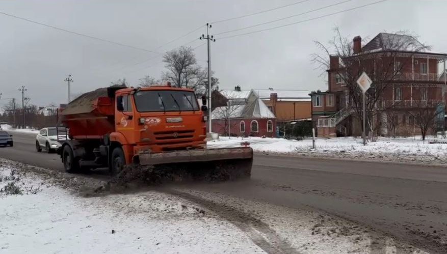 Идет отсыпка пескосоляной смесью для улучшения сцепления и предотвращения образования ледяной корки на дорогах.