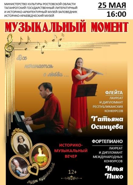 Шедевры классической музыки исполнят лауреат республиканских конкурсов, артист Таганрогского муниципального духового оркестра Татьяна Осинцева (флейта) и лауреат международных конкурсов, преподаватель и концертмейстер Таганрогского музыкального колледжа Илья Пико (фортепиано).