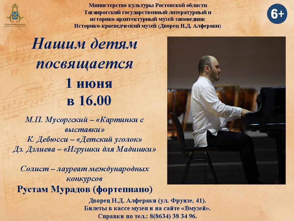1 июня, в Международный день защиты детей, в двусветном зале Дворца Алфераки Таганрога пройдет сольный концерт всемирно известного пианиста Рустама Мурадова.