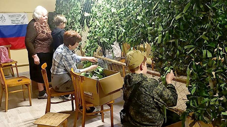 Работа в группе организована в две смены. Активистки приходят с детьми и внуками. Ростом те пока невелики – до середины сети, перекинутой через высокую перекладину, им не достать, но плести из маскировочных лоскутов гирлянду с перекрутом по нижнему краю вполне по силам.