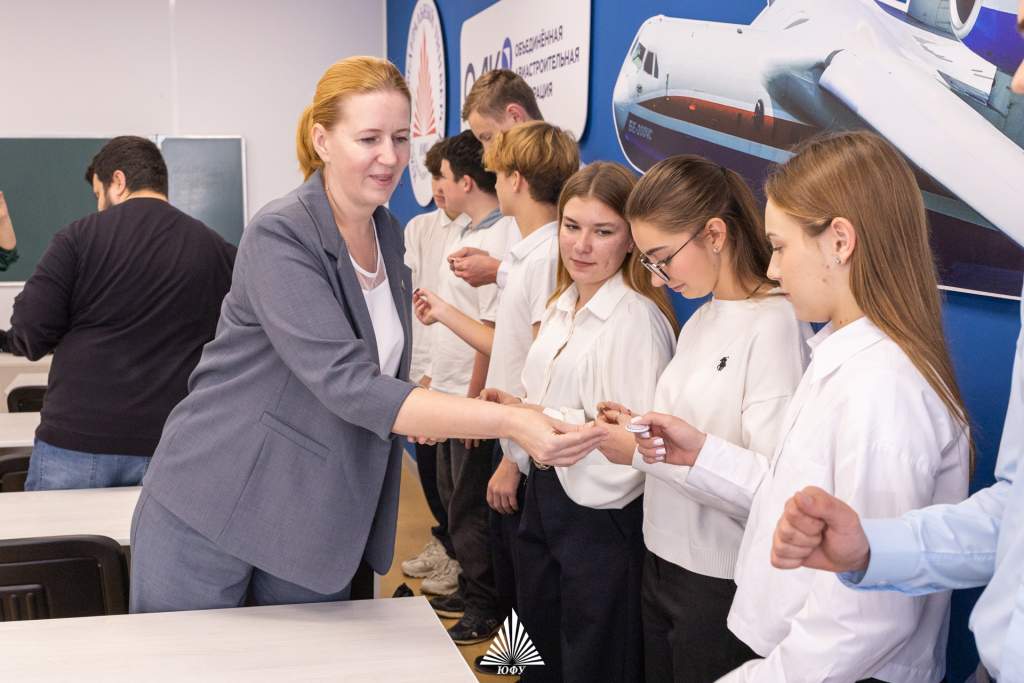 Основным моментом церемонии открытия аудитории стало посвящение учащихся в юные инженеры, на котором сотрудники университета и представители ТАНТК им. Г.М. Бериева (входит в ОАК) вручили школьникам памятные значки как символ их нового статуса.