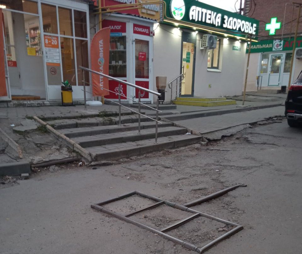 Горожане пишут, что оживленное место, где расположены несколько торговых точек, небезопасно. Разбитые плитка и ступеньки, торчащие куски асфальта и металлические предметы, ямы и колдобины — все это вызывает беспокойство.