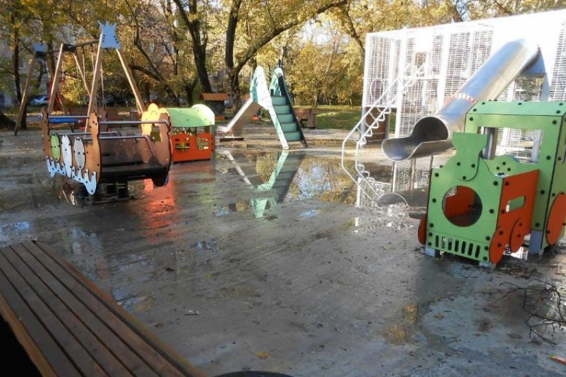 Отсутствует на площадке и дренажная система, из-за чего территория после дождя покрывается лужами. Еще один вопрос, возникающий у таганрожцев, — уборка детской площадки. Люди отмечают, что качели и горки грязные, все урны вокруг заполнены мусором, не убирается опавшая листва.