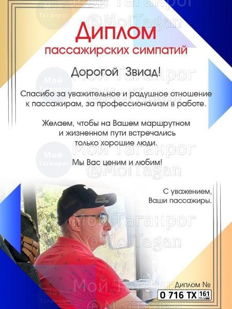 «Предлагаю хорошую историю о таганрогском водителе автобуса 35-го маршрута, об улыбчивом парне с грузинским именем Звиад. Часто езжу с ним, утром или вечером, на работу — с работы. Он обладает ценнейшими для его профессии качествами — доброжелательностью и удивительной стрессоустойчивостью. Думала, что это только моё личное восприятие человека, но, разговорившись с людьми в салоне, поняла –- так считают и другие постоянные пассажиры», — написала Татьяна Короленко.