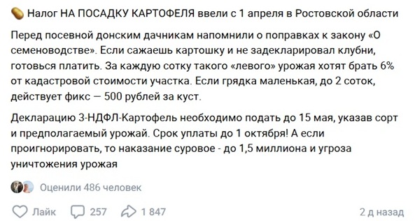 В социальных сетях распространяется недостоверная информация о введении с 1 апреля нового налога на посадку картофеля для жителей Ростовской области.