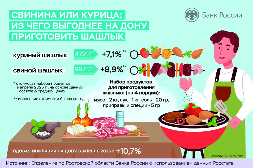 Чтобы определить «индекс шашлыка», эксперты выбрали два наиболее распространённых вида мяса — свинину и курятину. А для маринада — самый простой рецепт: лук, соль и специи. Затем были проанализированы средние цены на эти продукты на основе данных Росстата за апрель 2024 и 2025 годов. Выяснилось, что выгоднее для жителей Дона приготовить шашлык из курицы — за год он вырос в цене на 7%, а из свинины — почти на 9%.